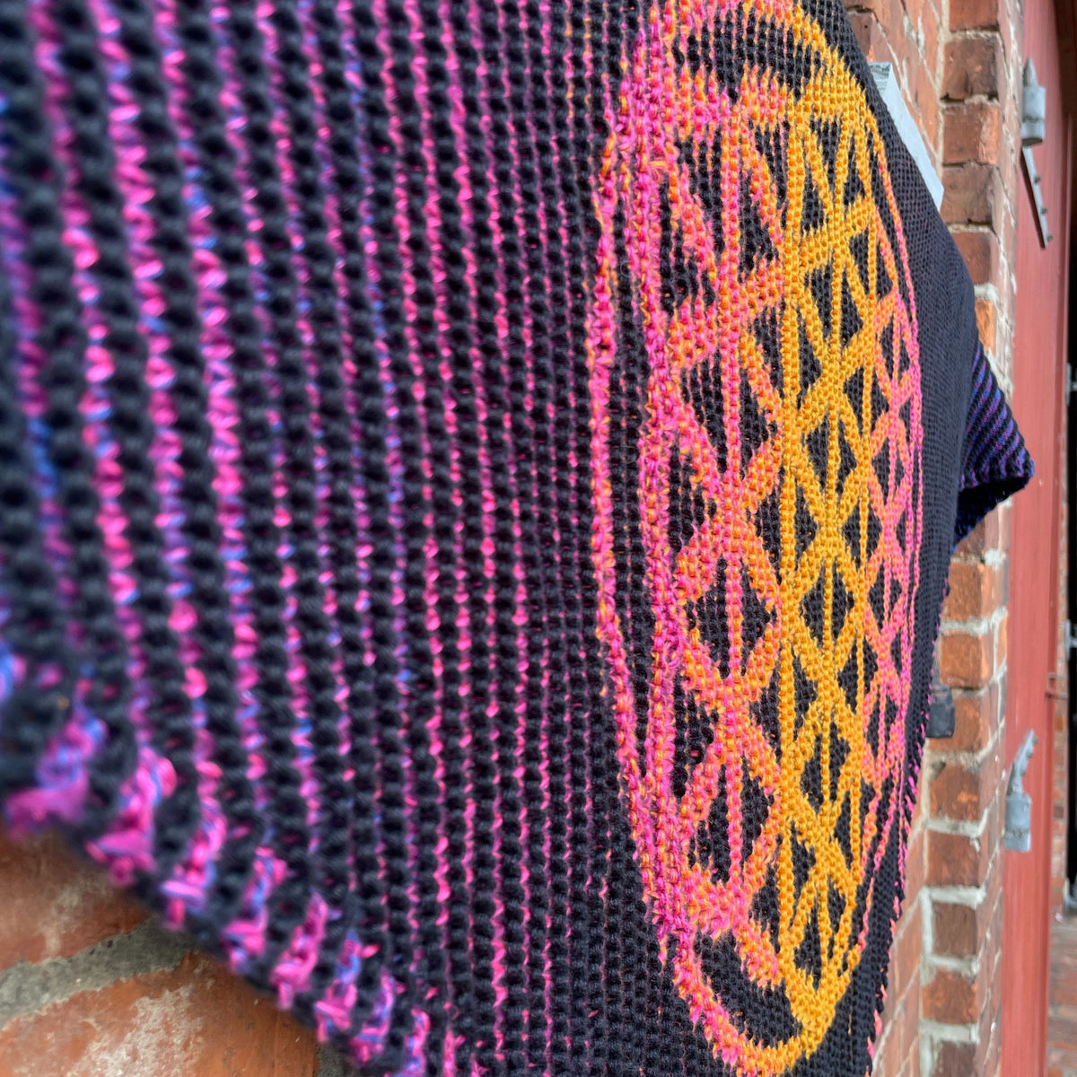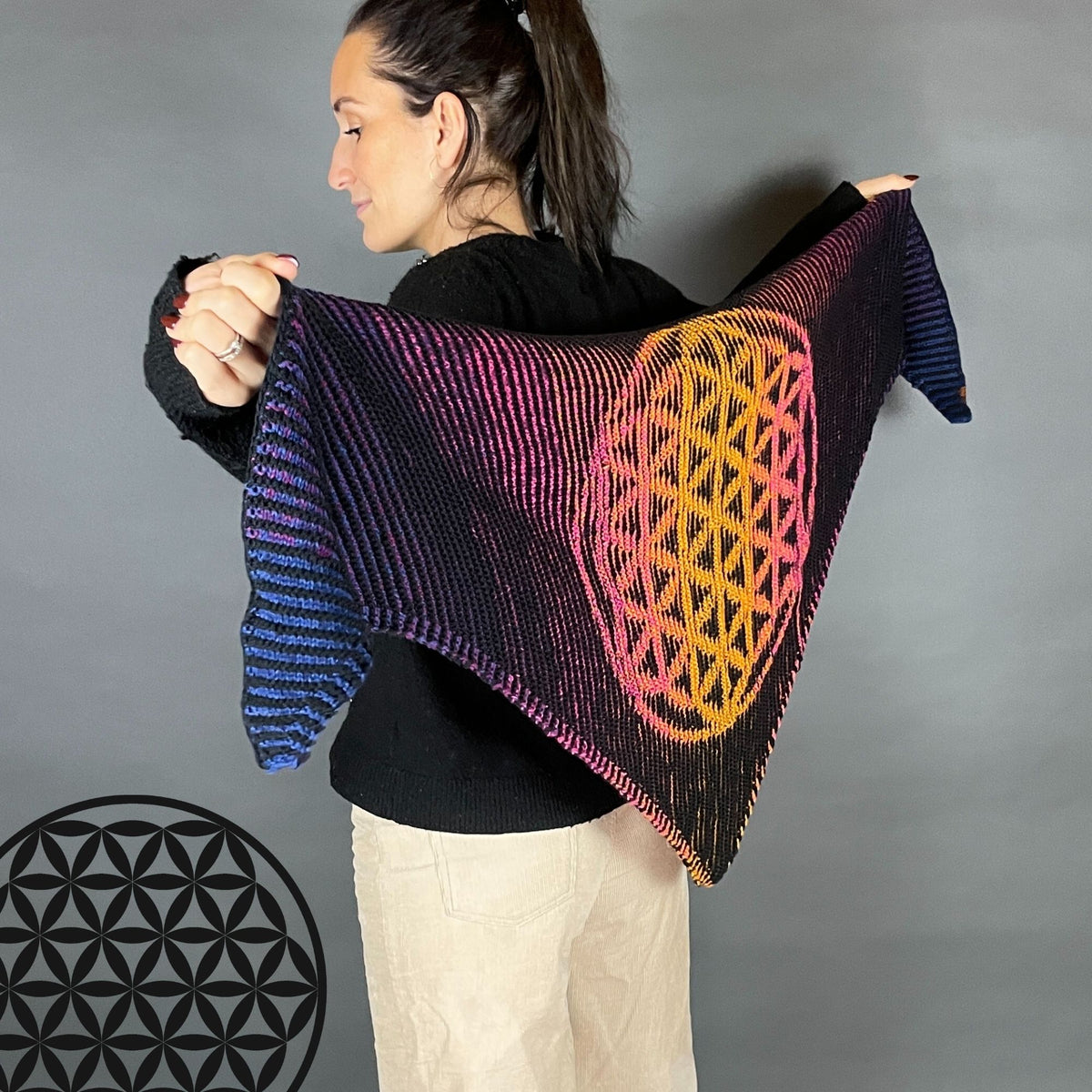 The Flower of Life combined with the popular shadow knitting technique makes this shawl the perfect project for knitting and, of course, for snuggling up in. The inner value of this shawl is only apparent when viewed from the side.