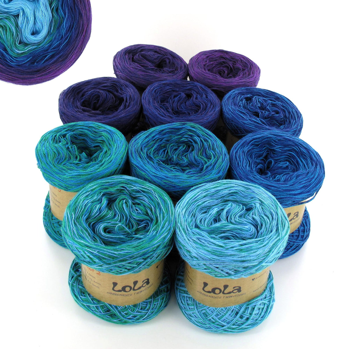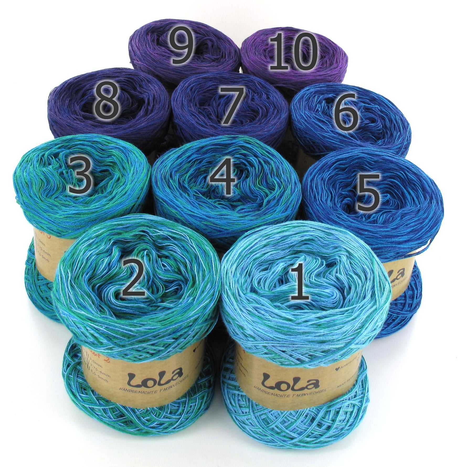 You get ten mini Lola Bobbels in a Bobbel Box, The individual balls are numbered so that you can always use the next colour section when working on the project if you choose to or you can use them in any order that you would prefer.