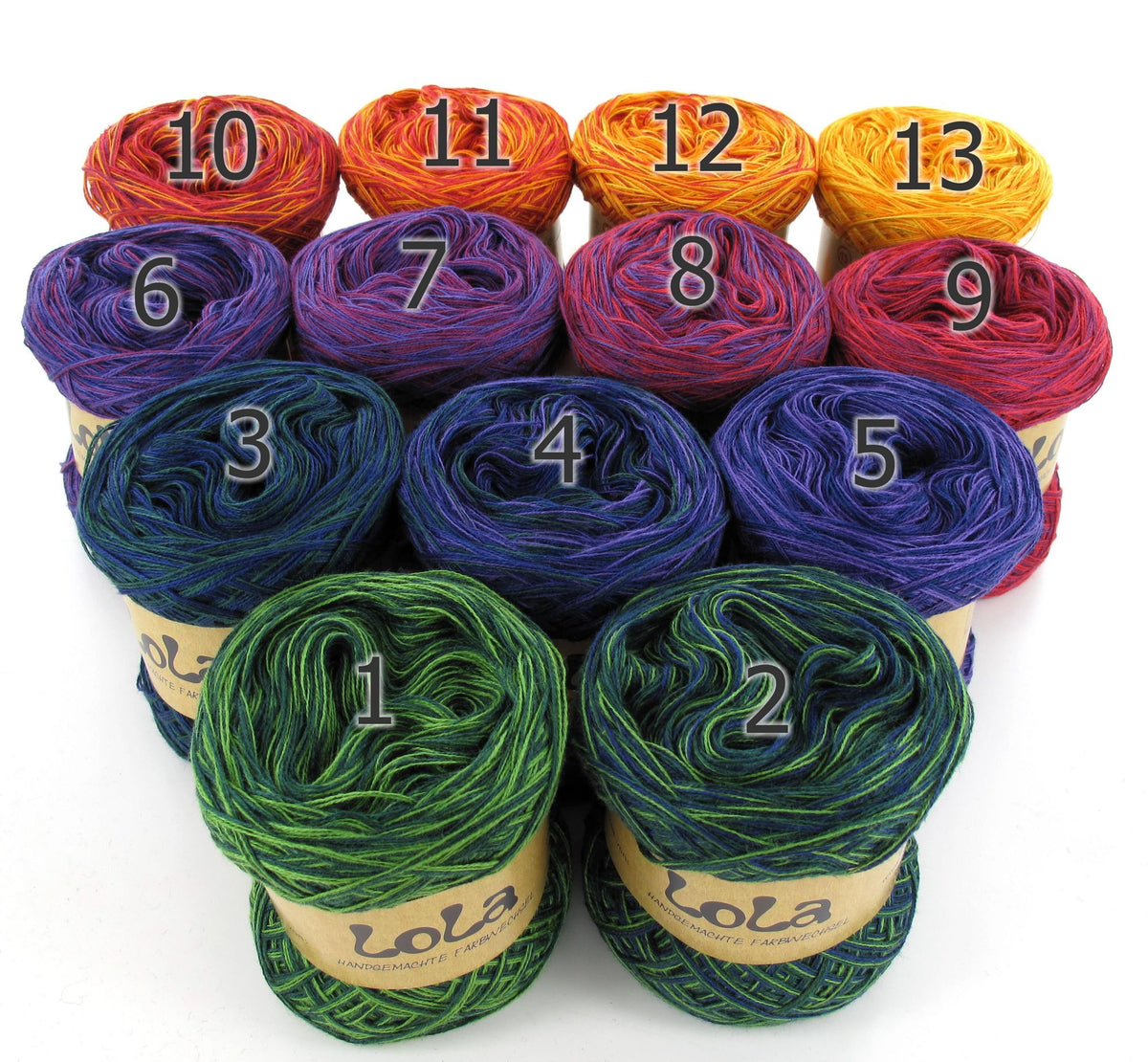 You get 13 mini Lola Bobbels in a Bobbel Box each 50gm, The individual balls are numbered so that you can always use the next colour section when working on the project if you choose to or you can use them in any order that you would prefer.