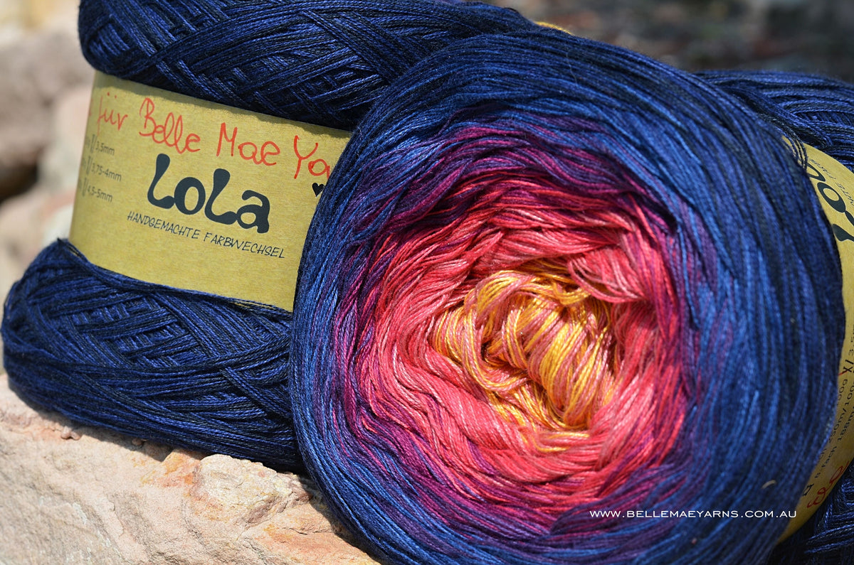 We have decided to call this gorgeous colourway - Earth Angel. The striking midnight blues encircle bold purple and berry tones, through to a heart tumeric. We know the months of planning and colour searching that went into the design of this well thought out lola and the colours speak for themselves, individually, whilst still remaining a blended colourway.