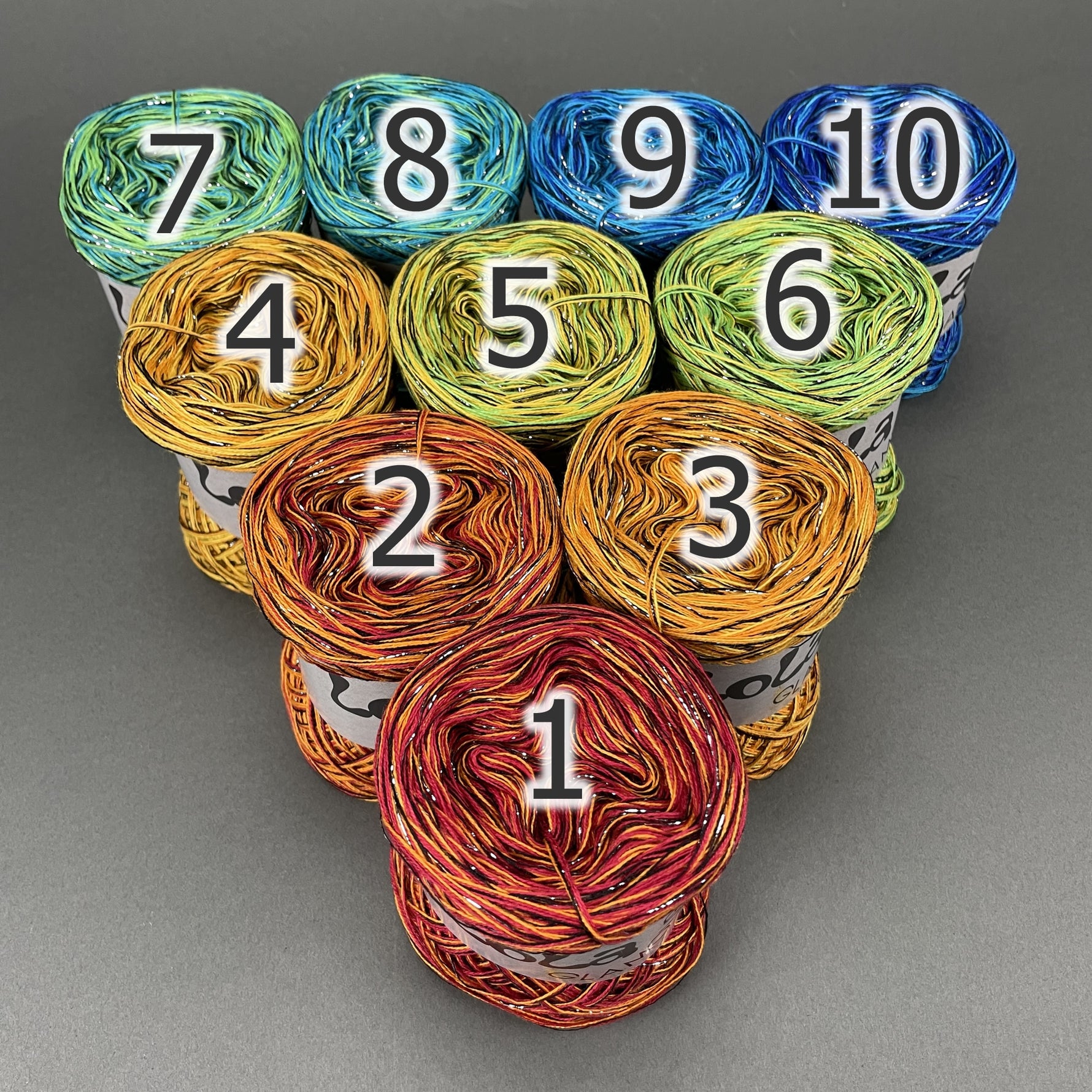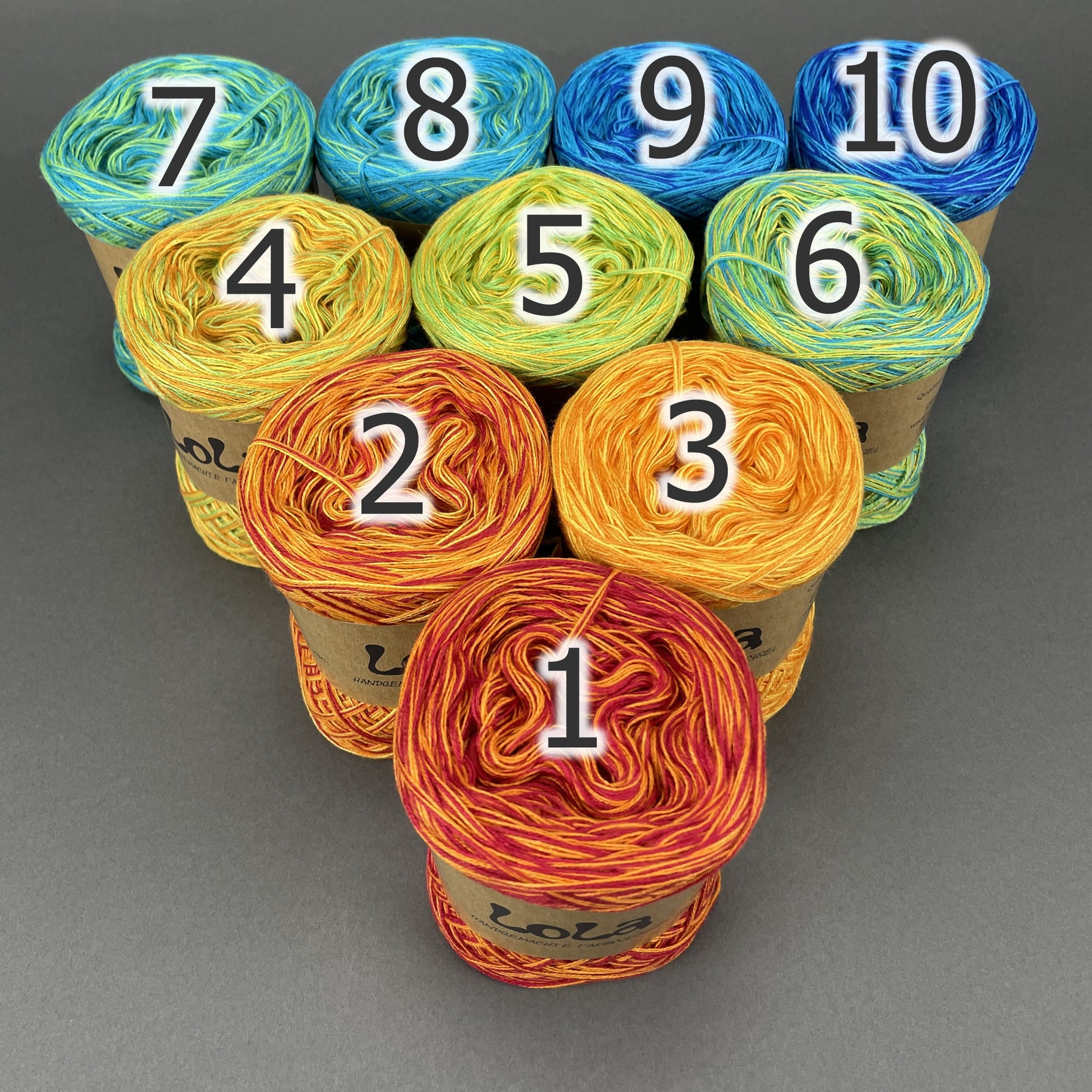 You get ten mini Lola Bobbels in a Bobbel Box, The individual balls are numbered so that you can always use the next colour section when working on the project if you choose to or you can use them in any order that you would prefer.
