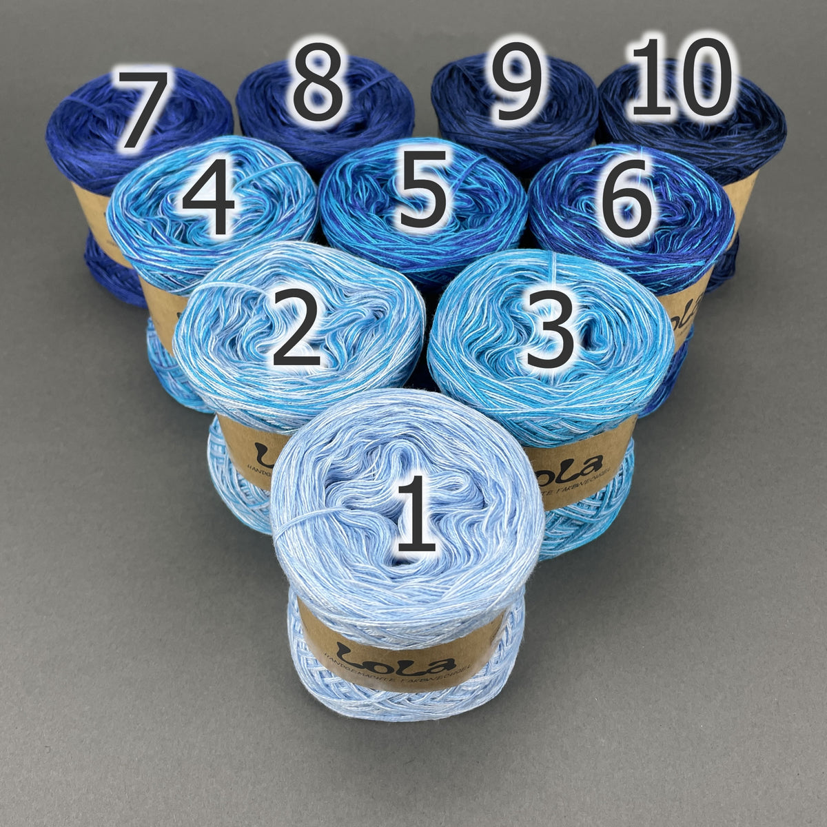 You get ten mini Lola Bobbels in a Bobbel Box, The individual balls are numbered so that you can always use the next colour section when working on the project if you choose to or you can use them in any order that you would prefer.