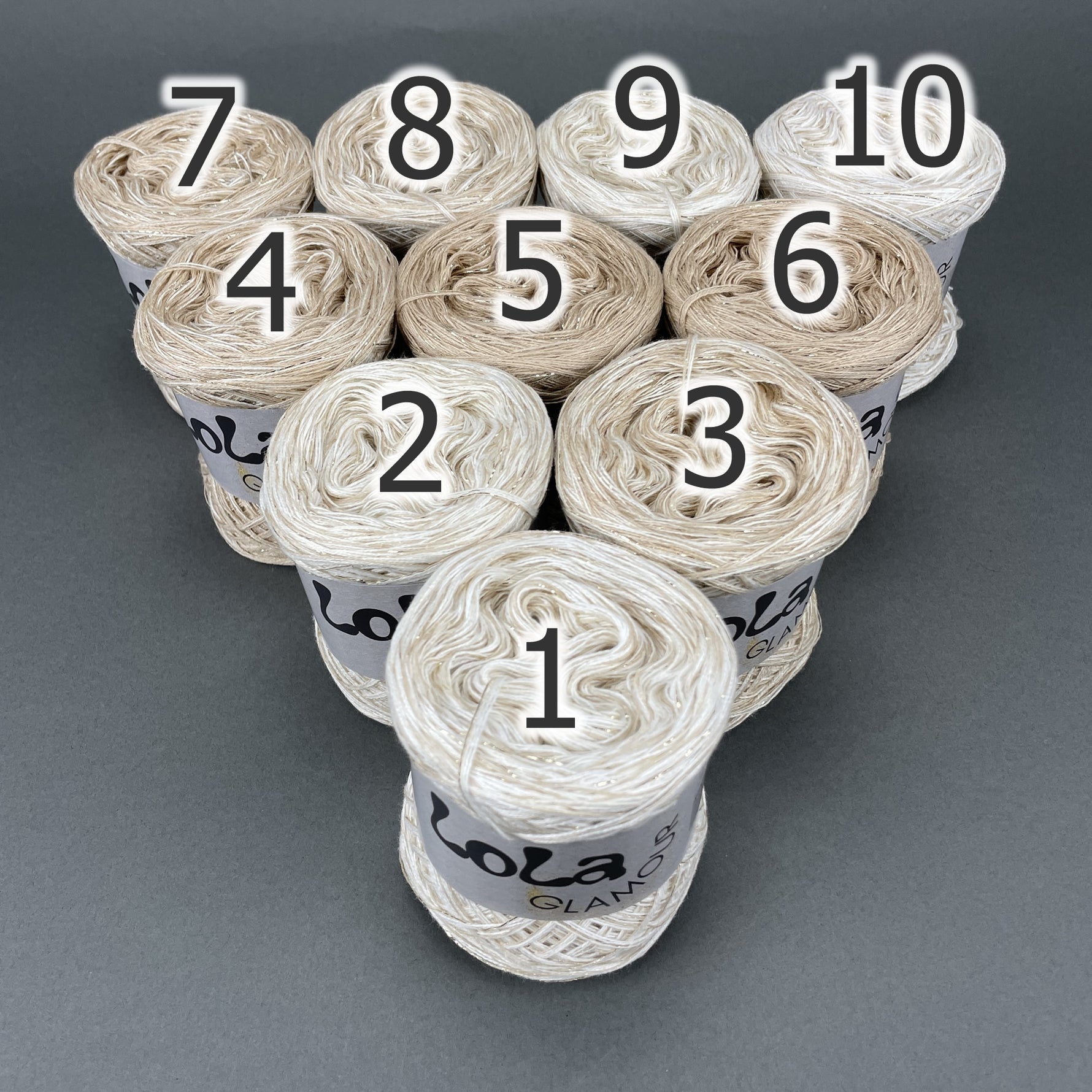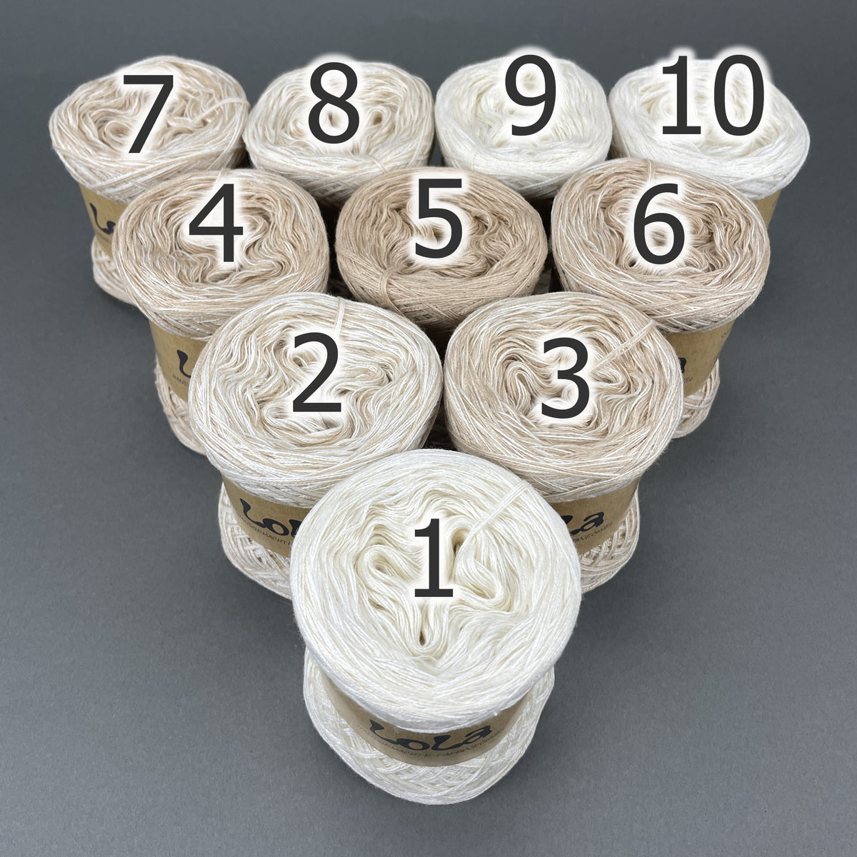 You get ten mini Lola Bobbels in a Bobbel Box, The individual balls are numbered so that you can always use the next colour section when working on the project if you choose to or you can use them in any order that you would prefer.