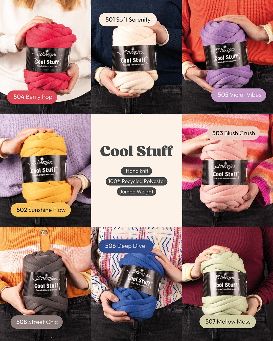 Scheepjes Cool Stuff is a jumbo yarn made from 100% Recycled Polyester. It consists of a jersey fabric tunnel filled with soft fibres. This innovative yarn combines strong stitch definition and cushiony comfort. Scheepjes Cool Stuff gives big results very fast, and is perfect for modern home décor projects and special accessories. No needles required: the unique structure and sturdiness make Cool Stuff perfect for hand knitting. The large stitches make it quick and easy to create handmade cushions, blankets, baskets and bags. Scheepjes Cool Stuff is kind to your skin and kind to the planet.