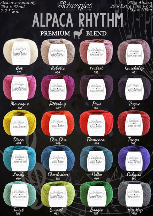 Made from an 80% Alpaca and 20% fine wool blend, Scheepjes Alpaca Rhythm is both silky-soft and luxurious, yet highly durable. Ideal for knitting tops and sweaters for the in-between seasons, A gorgeous a lace weight yarn, available in 20 beautifully coordinated colours that beg to be combined. Works beautifully in combination with Scheepjes Linen SoftScheepjes Catona and Scheepjes Whirls. . Available in the same range of colours as Scheepjes Mohair Rhythm.