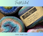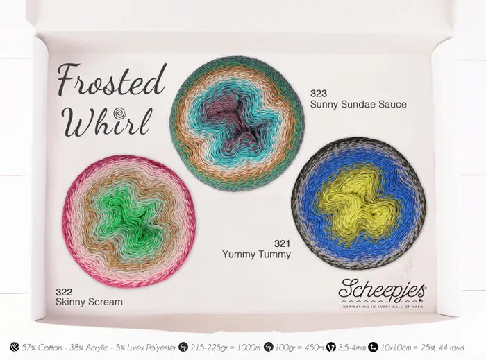 Scheepjes Frosted Whirl will add a wonderful hint of festive sparkle to your creative projects. Sharing in the same weight and size as the beloved Scheepjes Whirl yarns, Frosted Whirl differs in fibre, being made from a 57% Cotton, 38% Acrylic and 5% Lurex blend. Choose from three irresistible long gradient colourways with a subtle glitter effect that gives each shawl or garment a beautiful elegance. Create garments, homeware items and accessories that are simultaneously lightweight, breathable and stand-out with a beautiful drape. Unlike other gradient yarns, Scheepjes Whirl and Frosted Whirl have a generous twist to enable speed while working the yarn and to help prevent splitting. Each colourway also has a unique twisted ply which adds to the distinctiveness of each colourway. At each colour change, the fibres have been tied by hand leaving a subtle fluff or fuzz buzz which will hide discretely between your stitches, giving you a smooth, flawless finish with a characteristic flavour! The extra-large Scheepjes Frosted Whirl yarn cakes hold an enormous 1000 metres of softly colour changing yarn; more than enough for a large shawl or wrap. Frosted Whirl is a