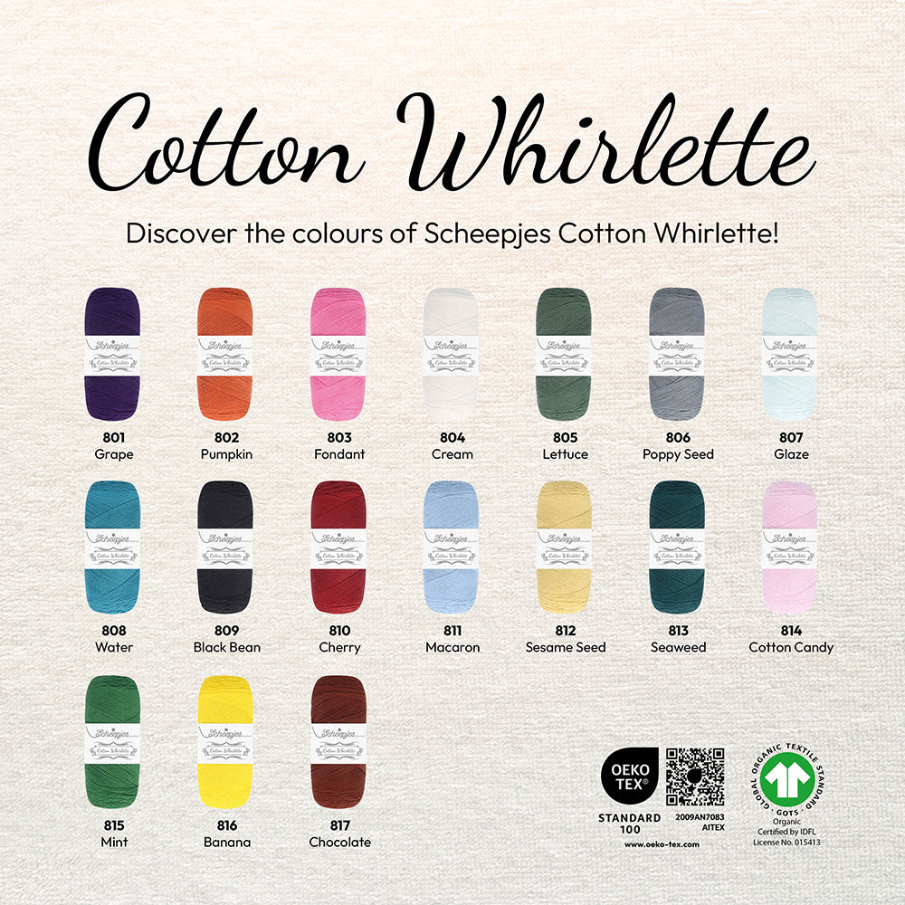 Scheepjes Cotton Whirlette offers all the bestselling features of the classic Whirlette, with a sustainable and eco-conscious twist. Crafted from 100% GOTS Certified Organic Cotton and produced using 100% recycled wastewater, Cotton Whirlette is the perfect choice for environmentally mindful crafters, vegan makers, and anyone who loves working with natural fibres.