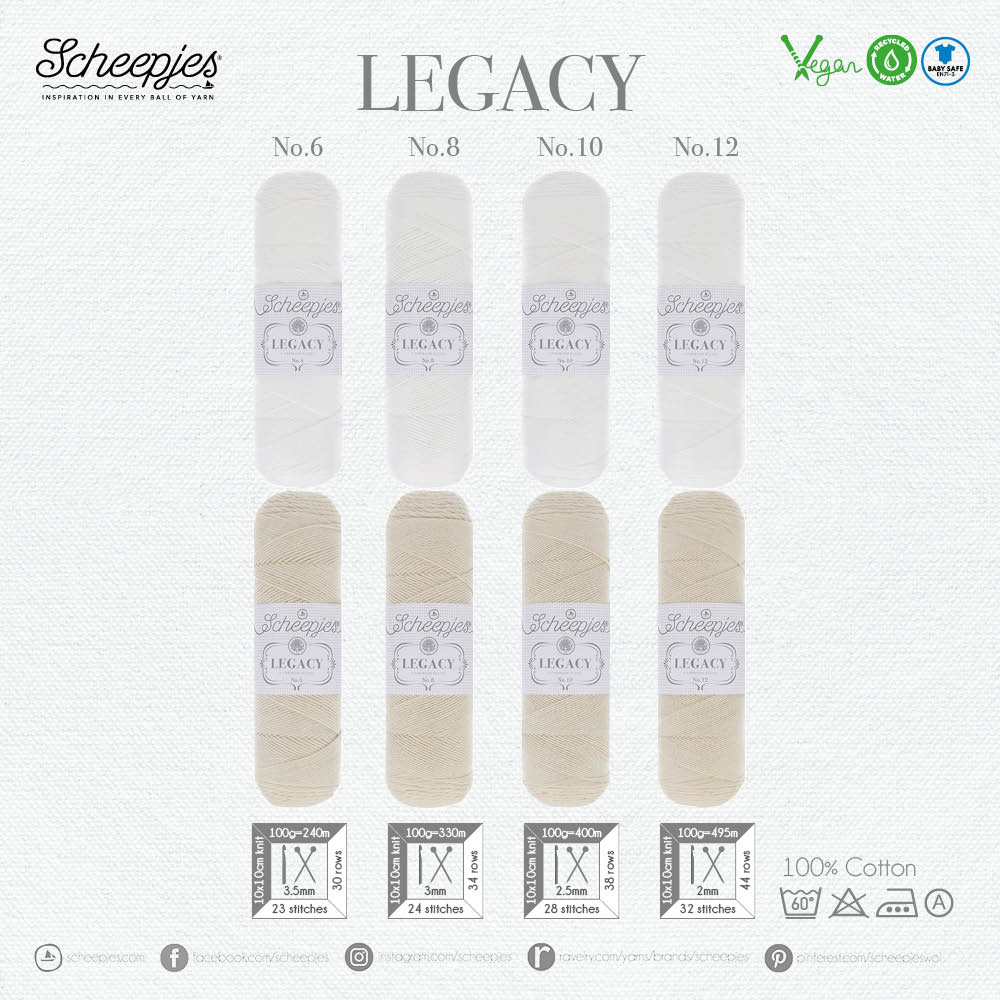 Scheepjes Legacy is undyed and available in two ranges: one premium blend 100% Cotton thread yarn, featuring a natural ‘matte’ finish, and a premium blend 100% Mercerised Cotton thread yarn, featuring a subtle sheen.