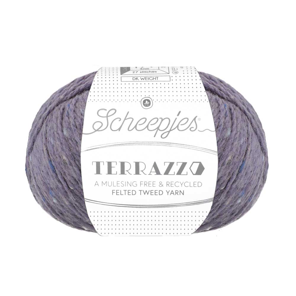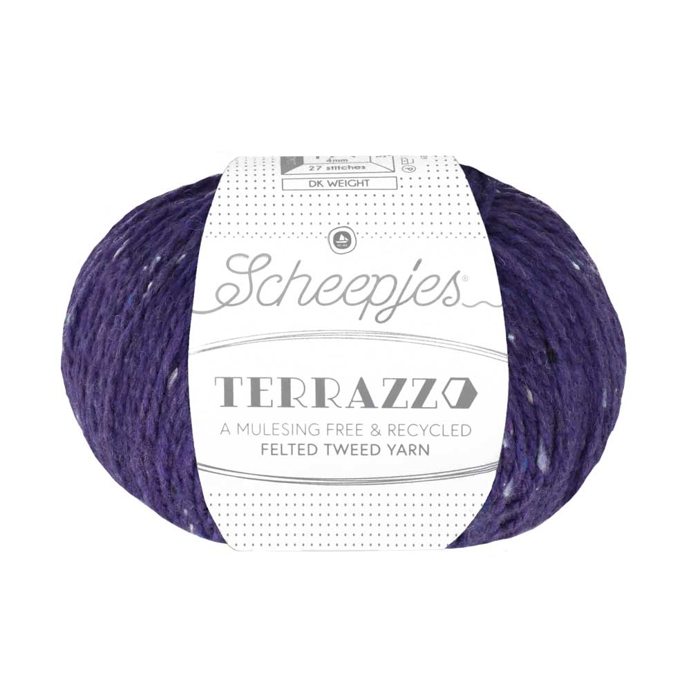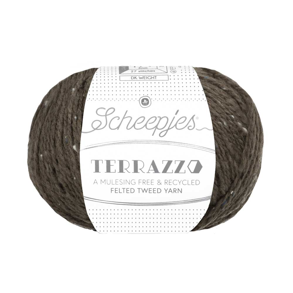 Terrazzo is made from a Premium blend of 70% Recycled Mulesing Free Wool and 30% Recycled Viscose. This felted, tweed yarn has a luxurious look and feel. The subtly speckled colour effect, reminiscent of terrazzo floors, is achieved by twisting fibres of contrasting and complementary colours.