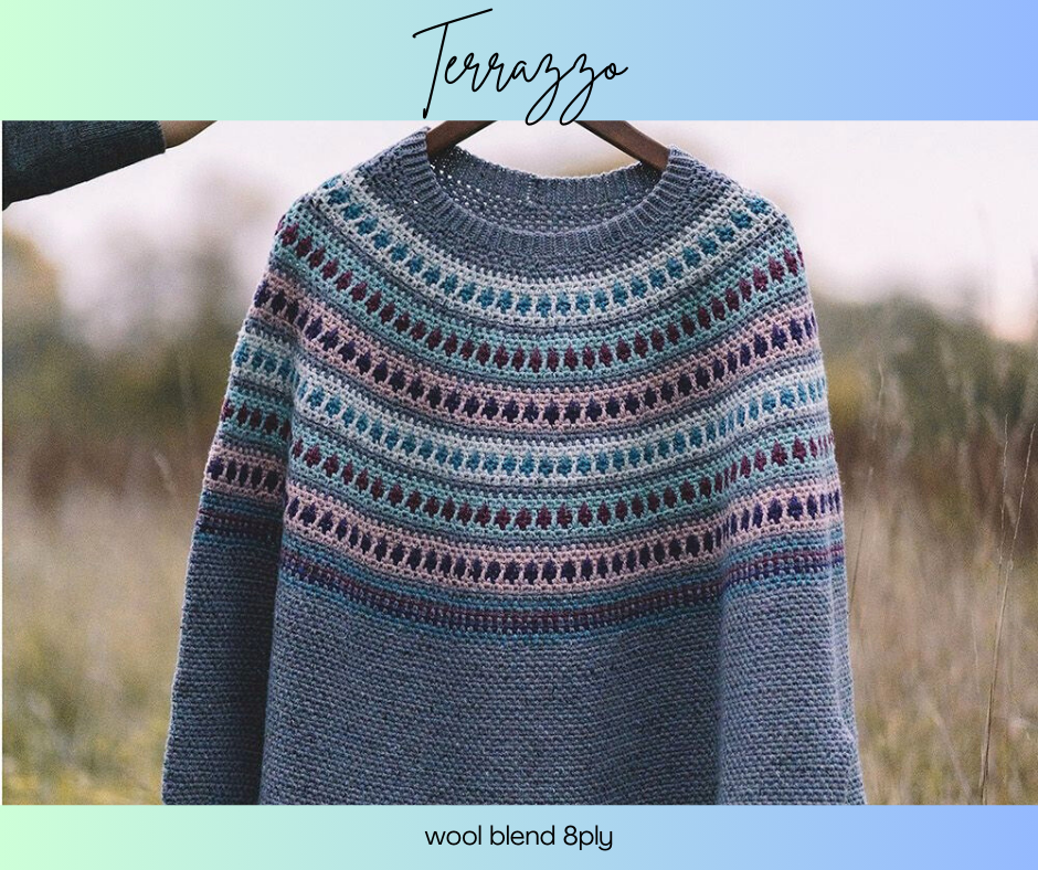 Scheepjes Terrazzo benefits from the breathability of Wool and Viscose and combines the best qualities of both. Lightweight Viscose is moisture absorbent and gives a silky soft feel with beautiful drape, while the wool contributes the rustic appearance and wonderful warmth. This makes Terrazzo suitable for a diverse range of crochet and knitting projects of all shapes and sizes: from clothing, such as sweaters and cardigans, to fashion accessories and homeware. It’s perfect also for knitting and crocheting in multiple colours and can be effectively combined with Scheepjes yarns in other textures, such as Alpaca Rhythm and Mohair Rhythm.